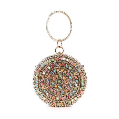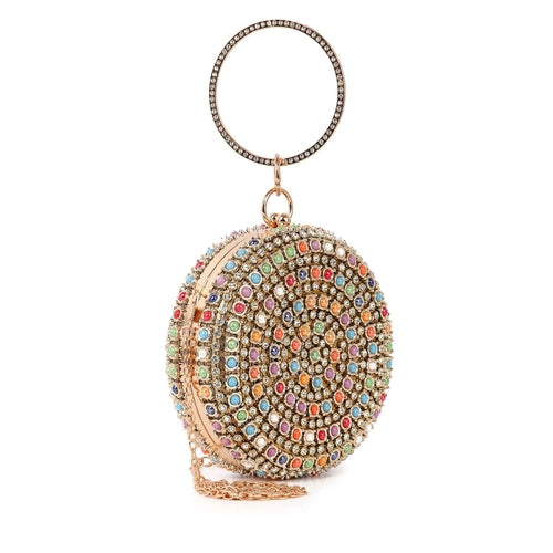 A chic evening bag is covered in colored rhinestones that catch the light—and lots of compliments.